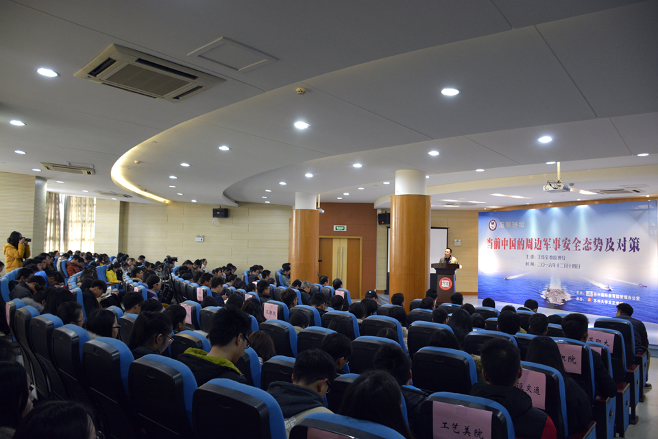 12月14日下午,解放军南京政治学院教授、博士生导师王传宝做客石湖讲坛,围绕《当前中国的周边军事安全态势及对策》这一主题,为包括我院在内的苏州国际教育园进驻院校数百名师生带来了一场令人振奋、感动也让人深思的演讲。讲座由我院党委副书记、副院长袁昌兵主持。苏州国际教育园管理办公室国际合作与教育培训处倪忠平、吕晓春、潘炜等领导,以及苏州工业职业技术学院的思政教师也一同到场聆听讲座。