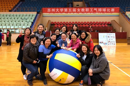 3月8日下午,为庆祝“三八”国际劳动妇女节,苏州大学第五届女教职工气排球比赛在校体育馆隆重举行。本次大赛由苏州大学校工会主办、体育学院协办,共有30支队伍参加,我院获得第三名的好成绩。