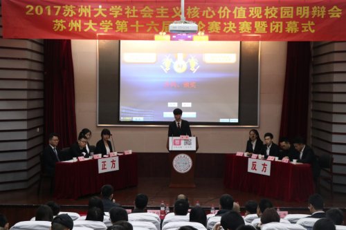 4月8日晚,2017年苏州大学社会主义核心价值观校园明辨会暨苏州大学第十六届辩论赛决赛在本部学术报告厅举行。苏州大学党委副书记、副校长江作军,团委书记肖甫青,我院党委副书记、副院长袁昌兵,学生工作部部长、学生工作处处长卞海勇出席活动。我院由袁妮、徐卓彬、商镪、张文琪等四位同学组成的代表队勇夺冠军。