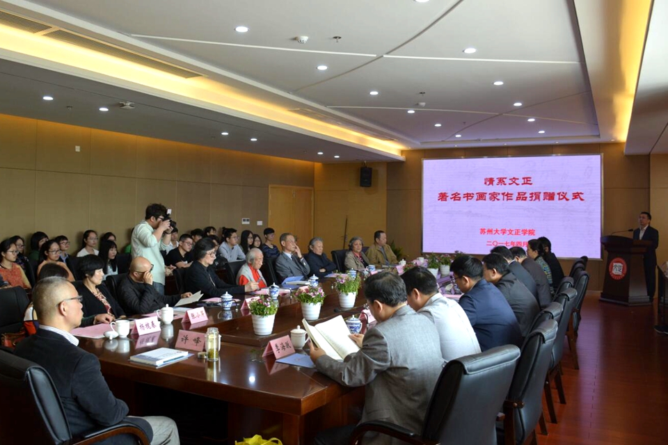 苏州市范仲淹研究会秘书长许峰先生,著名收藏家、艺术评论家季海跃先生,著名画家张小芹女士,著名艺术品策展人杨槐春女士等也参加了捐赠仪式。参加捐赠仪式的还有我院副院长蒋峰、相关职能部门负责人以及艺术专业、相关学生社团学生代表。