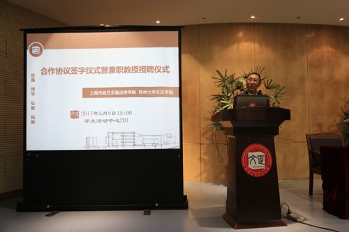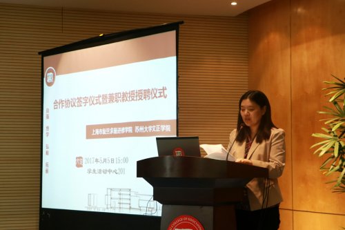 (翠文报记者:沈茜慧、贺一凡/文)5月5日下午,我院与上海市复旦求是进修学院“资本市场实训基地”合作签约仪式暨兼职教授聘任仪式在学生活动中心201举行。上海市复旦求是进修学院副院长赵昌运、东吴证券股份有限公司苏州现代大道营业部投资顾问顾万荣、华泰证券股份有限公司苏州吴中大道证券营业部总经理陆志洲等嘉宾出席仪式,我院院长吴昌政,副书记、副院长袁昌兵,调研员徐子良以及相关系科、职能部门负责人参加活动。仪式由副院长施盛威主持。
