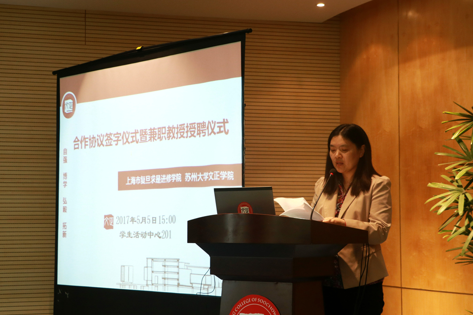 (翠文报记者:沈茜慧、贺一凡/文)5月5日下午,我院与上海市复旦求是进修学院“资本市场实训基地”合作签约仪式暨兼职教授聘任仪式在学生活动中心201举行。上海市复旦求是进修学院副院长赵昌运、东吴证券股份有限公司苏州现代大道营业部投资顾问顾万荣、华泰证券股份有限公司苏州吴中大道证券营业部总经理陆志洲等嘉宾出席仪式,我院院长吴昌政,副书记、副院长袁昌兵,调研员徐子良以及相关系科、职能部门负责人参加活动。仪式由副院长施盛威主持。