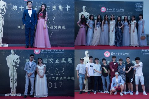 本届奥斯卡颁奖嘉宾由我院学生会、各系科主要学生干部以及国际教育园区部分高校学生会主席组成,他们身穿正装、礼服出席。进入会场之前,他们走过红地毯并在签名板前合影留念。