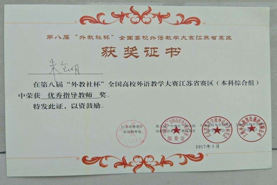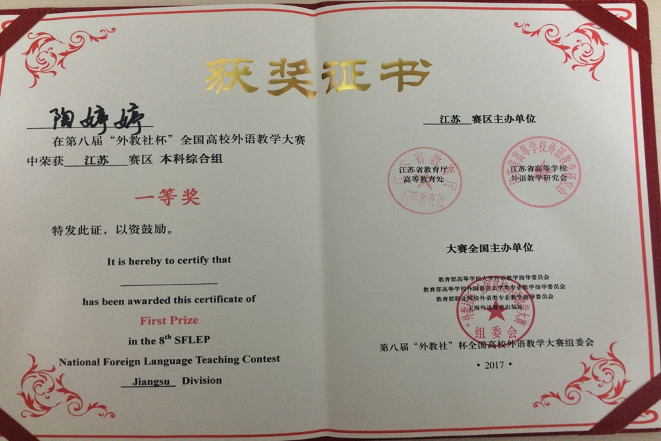 2017年5月26日至27日,第八届“外教社杯”全国高校外语教学大赛决赛(江苏赛区)在南通大学外国语学院举行。经过两天激烈的角逐,我院大学英语青年教师陶婷婷凭借出色的表现,最终荣获本科综合组一等奖,我院大学英语负责人朱全明荣获优秀指导教师奖。