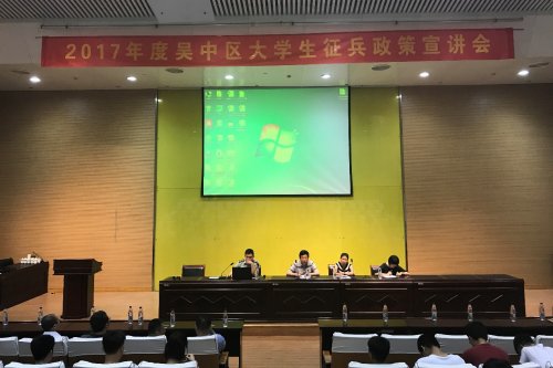 征兵工作宣讲会由吴中区人武部参谋张家玉主持,张参谋在宣讲会上结合当前国内外政治军事形势及我国饱受西方列强侵略、欺辱的历史指出当代大学生参军入伍,报效祖国的历史意义和现实意义。同时,对大学生应征入伍优惠政策法规等与青年学生做了详细的分析和解读,为帮助大学生算清参军入伍的“政治账、经济账、成才账”,激发了参军热情,指出大学生征兵入伍,这既是国防建设、社会建设的需要,也是大学生自我成才的需要。