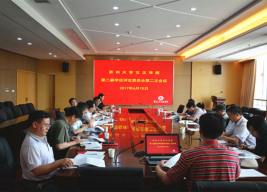 会议伊始,吴昌政致欢迎辞,并宣读《关于调整苏州大学文正学院第二届学位评定委员会组成人员的通知》且颁发聘书,调整后,我院第二届学位评定委员会由18人组成,设主席1人,副主席3人,委员14人;施盛威就《苏州大学文正学院学位评定委员会工作细则》进行解读与说明;教务处处长胡荣汇报了2017届毕业生学士学位初审情况,并从初次毕业率、初次学位授予率、学位待审原因三个方面对审核结果做了详细说明与分析。与会委员通过无记名投票方式,对学士学位初审情况进行表决,一致同意授予符合学士学位授予条件的2737名学生苏州大学文正学院学士学位。