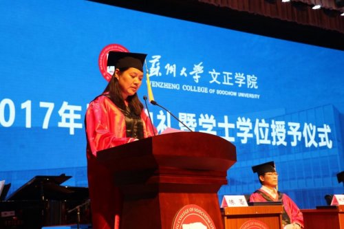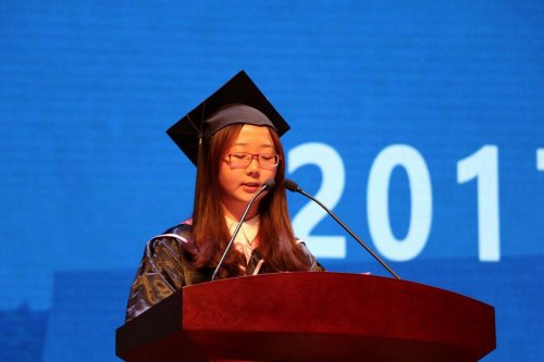 2017届毕业生项晨佳、胡梦媛、仇成功作为优秀毕业生代表上台发言,并与全体毕业生共同宣读毕业誓词。