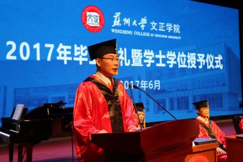 6月18日,我院二〇一七届学生毕业典礼暨学士学位授予仪式在综合楼多功能厅隆重举行。苏州大学研究生院院长郎建平教授、苏州大学教务部部长周毅教授以及我院院长吴昌政、副院长施盛威等出席了典礼。典礼由我院副书记、副院长袁昌兵主持。