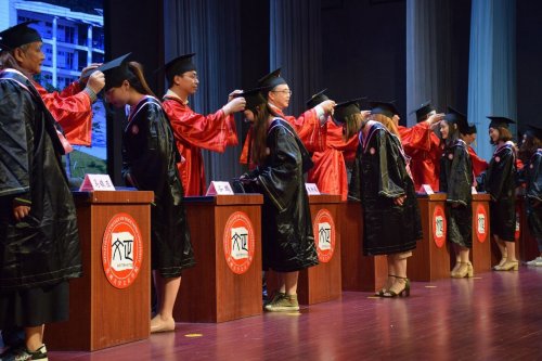 学位评定委员会委员为获得学士学位的毕业生扶正流苏、颁发学位证书,并以合影定格下这难忘的一刻。