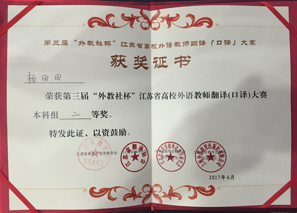 6月18日,第三届“外教社杯”江苏省高校外语教师翻译(口译)大赛在无锡太湖学院举行。经过激烈角逐,我院大学英语青年教师杨田田凭借优异表现,获得本科组二等奖。这是我院外语系继全国高校外语教学大赛(江苏赛区)中取得佳绩之后获得的另一喜人成绩。