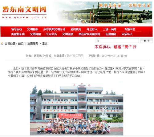 我院暑期社会实践在秉承传统优势,坚持特色创新的基础上,早计划、广宣传,参与实践的学生们在指导老师的带领下,勤于学习、善于创造、甘于奉献、不断提高,不仅很好地完成了实践任务,还充分展示了自身能力,为学院树立了良好形象。目前,我院“唱响青春之歌”宣讲团、“依法治国背景下关于基层法治建设现状调研团”、“爱·黔行”贵州支教团队等受到了姑苏晚报、光明网、凤凰江苏、黔东南文明网等媒体的报道,获得了较好的社会评价。