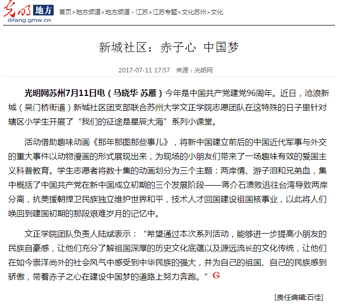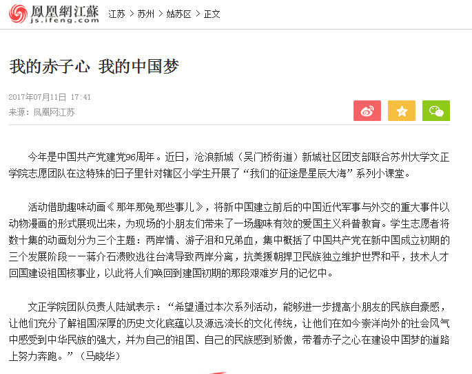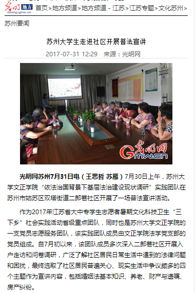 我院暑期社会实践在秉承传统优势,坚持特色创新的基础上,早计划、广宣传,参与实践的学生们在指导老师的带领下,勤于学习、善于创造、甘于奉献、不断提高,不仅很好地完成了实践任务,还充分展示了自身能力,为学院树立了良好形象。目前,我院“唱响青春之歌”宣讲团、“依法治国背景下关于基层法治建设现状调研团”、“爱·黔行”贵州支教团队等受到了姑苏晚报、光明网、凤凰江苏、黔东南文明网等媒体的报道,获得了较好的社会评价。