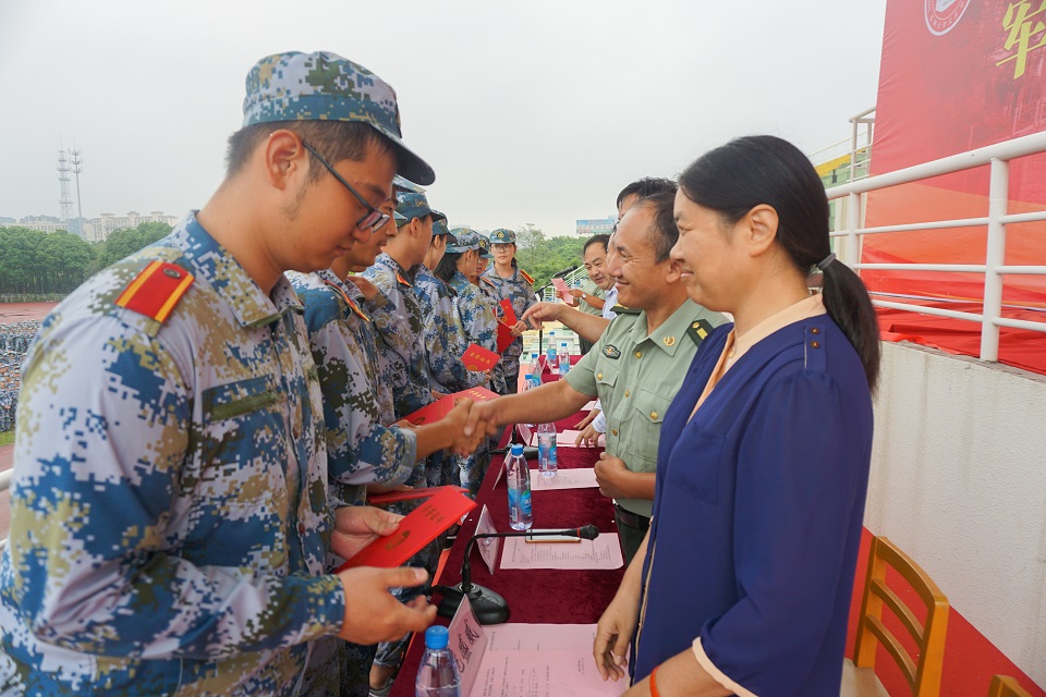 施盛威宣读了我院2017级学生军事技能训练先进集体、先进个人名单。主席台就坐的领导分别为先进连队、优秀指导员、优秀学员等获奖代表颁奖。