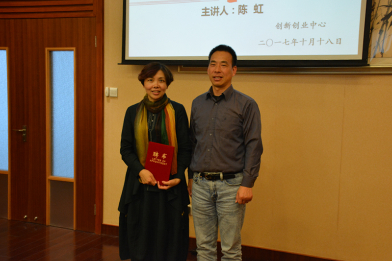 最后,学生发展中心特聘陈虹为我院学生创新创业指导老师,由王淼颁发聘书。王淼鼓励菁英提高班的学员们互相交流,积极参与创业相关活动,通过实践提高自身能力。同时,王淼希望此次经验分享能使得学员们对“营销”概念更加清晰,有助于学员在未来创业过程中明确定位、确立创业方向。