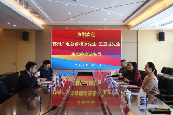 10月30日上午,苏州广电总台新闻夜班车乐活六点档主播杨冰先生、苏州广电总台技术部主任王卫成先生、苏州大学凤凰传媒学院播音主持艺术专业负责人祝捷副教授前来我院,对我院播音与主持艺术专业实验室建设方案进行论证。会议由学院副院长施盛威主持。
