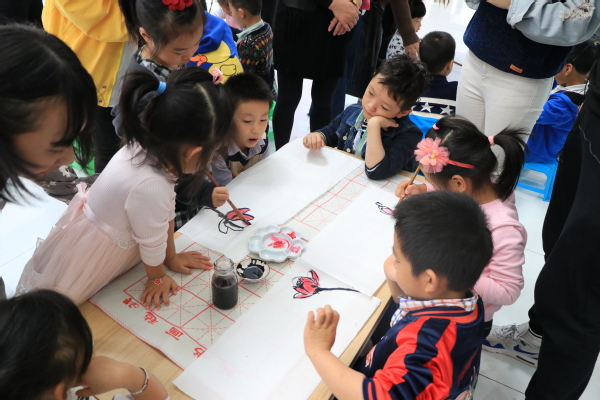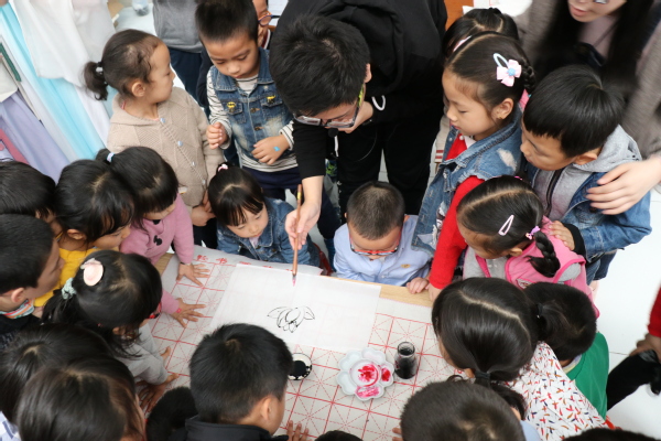 好动是孩子的天性,没想到静以养性的书画体验课让小朋友们参与的很起劲。“像不像,三分样”,尽管全无书画基础,基本功的训练却不能半点马虎。正手形、端坐姿、起落笔,在墨缘艺术社和绘画社同学们手把手的教导下,一个个小书法家眼看着有了几分模样。点、横、竖、撇、捺,水写布上的处子秀虽然东倒西歪,但那股子认真劲儿还真是不输年少时的王献之。国画老师吴汝航同学现场十来分钟时间草就的雄鸡图不仅小朋友们争相传阅,更让随行的幼儿园老师们赞赏有加。