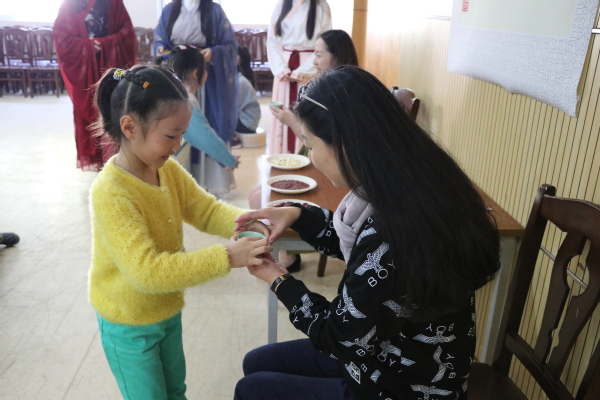 欢迎仪式在汉服社成员们的汉服秀表演中拉开帷幕。婀娜娴熟的舞姿配以美丽精致的古装和古朴典雅的中国风乐曲,迅速吸引了小朋友们的注意力。不同服装的色彩搭配、刺绣的图案、形态各异的系扣穿着形式都成为小朋友们相谈甚欢的内容。