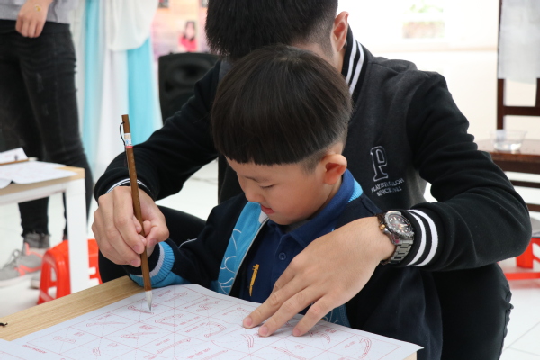 九十名小朋友分成三组,由爱心社的志愿者同学带领着,在书法国画、礼茶拜师、论语典故三个小课堂轮流体验。学生活动中心一层因为这群特殊小观众的到来,增添了别样的热闹与活力。