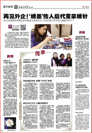 辞职后,郁竹君觉得,自己应该传承苏绣这门技艺,“也许就像母亲说的,我的血液里也流淌着苏绣的‘因子’吧,作为‘绣圣’传人的后人,我觉得自己也有一份责任将这门古老的文化遗产传承,并发扬光大。”郁竹君告诉紫牛新闻记者。