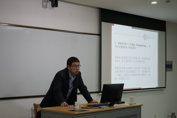 讲座在陈一幽默风趣的现场提问中开始,他通过讲述卢米埃尔兄弟的《火车进站》,告诉大家这是一个新媒体环境不断变化的时代。针对新时代的新定义,他分别从新媒体新问题、如何引导青少年、高层的说法和做法,以及媒体人该怎么做等四个角度,探讨我们该如何面对和使用新媒体。他认为,新媒体也具有浓厚的“中国特色”,大学生在面对大量的网络信息时,需兼听则明,常怀质疑之心,以理性态度对待网络舆论。同时,他通过播放和推荐视频短片、列举真实的新媒体新闻传播案例、讲述案例背后的故事等,使同学们对新媒体有了不同以往的新理解。此外,他特别鼓励同学们在娱乐休闲的同时,能借助专业知识,运用新媒体工具,做一些有意义的事,“从一位新媒体的接受者、使用者、消费者,成为一名生产者”。