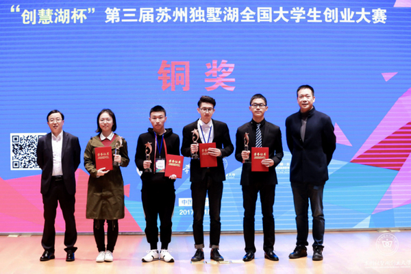 11月17日,“创慧湖杯”第三届苏州独墅湖全国大学生创业大赛总决赛在苏州大学独墅湖校区隆重举行。本次大赛由苏州独墅湖科教创新区管理委员会与苏州大学联合主办,苏州独墅湖创业大学以及苏州大学学生创新创业教育中心共同承办。全国85所高校近600个项目报名参赛,经初赛、复赛,30支团队进入总决赛,决赛分A、B两组同时进行,共决出金奖2名、银奖5名,铜奖8名以及鼓励奖15名。我院创意创业园孵化项目“苏州甲库档案信息科技有限公司”,凭借其优异表现,以A组第六的成绩荣获铜奖。