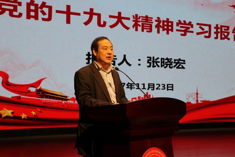 1123日上午,省委宣讲团成员、十九大代表、苏州大学副校长张晓宏教授来我院作党的十九大精神学习报告。宣讲会在我院综合楼多功能厅举行。参加报告会的有省委宣传部吴瑾同志、学院领导班子全体成员、党员及部分教工、学生代表。报告会由我院党委书记仲宏主持。