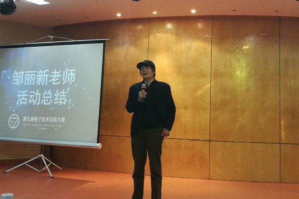 最后,邹丽新总结发言。邹老师首先对各位嘉宾和评委老师对本次活动的指导和帮助表示感谢。他表示,现在人类社会进入智能时代,对电子技术技能的需求增加,希望各位同学能够准确把握社会发展脉搏,将“第二课堂”实践与“第一课堂”学习有机结合,提升自己的综合能力。