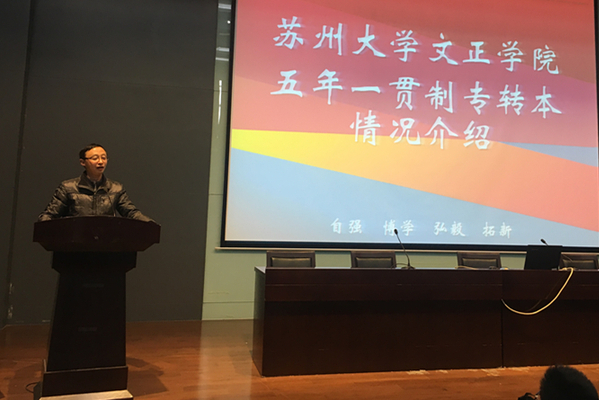 会上,周建军向江苏省昆山第一中等专业学校2018届近300名学生介绍了我院发展历程、系科及专业设置情况、学分制学生培养方案、学生创就业情况、五年一贯制专转本招生专业情况、专业考试内容及要求等,利用大数据对近年来江苏省昆山第一中等专业学校学生报考我院五年一贯制专转本情况、学生入学后的学习、生活以及就业情况进行了介绍,欢迎更多的江苏省昆山第一中等专业学校的学生报考我院。