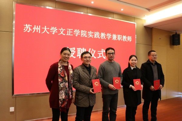 施盛威宣读聘任通知并为苏州新锐合金工具股份有限公司型材事业部制造厂厂长严永林、苏州工业园区贝思乐教育培训中心区域HR总监惠中侠、苏州常青树教育咨询有限公司总经理彭浩以及苏州艾丁心理咨询服务有限公司心理精神科主治医师、心理治疗师吴震卿等四位受聘兼职教师颁发聘书。
