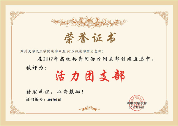 2015 级法学团支部以积极培育社会主义核心价值观为理念,进行思想政治教育、学风建设、团组织建设、校内外专业实践等丰富活动,值得一提的是,15法学团支部通过举办“模拟法庭”、庭审观摩和“拾年”法学校友论坛等主题团日活动,加深同学们对于专业实践的理解,做好未来职业生涯的发展规划,其中“模拟法庭”和“拾年”主题团日获苏州大学校级十佳团日和院级最佳创新奖。经过两年多的探索与努力逐渐实现了大学生的自我管理、自我服务、自我提高,也使得团支部在各项评奖评优中屡获佳绩,曾荣获“文正学院优良学风班”“苏州大学红旗团支部”“江苏省先进班集体”等荣誉称号。
