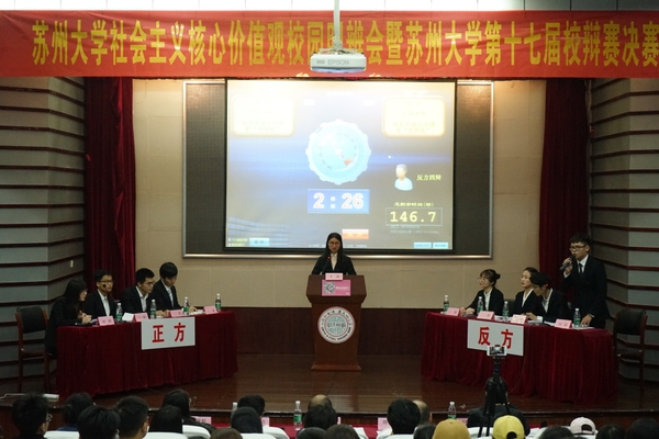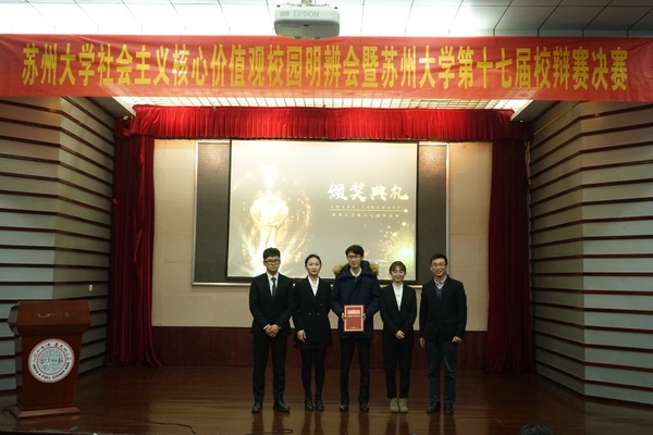 4月14日晚,苏州大学社会主义核心价值观校园明辨会暨苏州大学第十七届校辩赛总决赛在天赐庄校区红楼学术报告厅举行。苏州大学辩论队教练陈国坤、苏州大学政治与公共管理学院教授庄友刚、苏州大学教育学院副教授吴铁钧、苏州大学辩论队2012级队长吴雪张美、苏州大学辩论队2013级队长秦黛新担任决赛评委。我院院长助理、学生工作部部长(兼)卞海勇出席活动。我院由文正辩论社社员雷佳璇、孙鹤铭、庄稼会、严怿舟等同学组成的代表队荣获亚军。