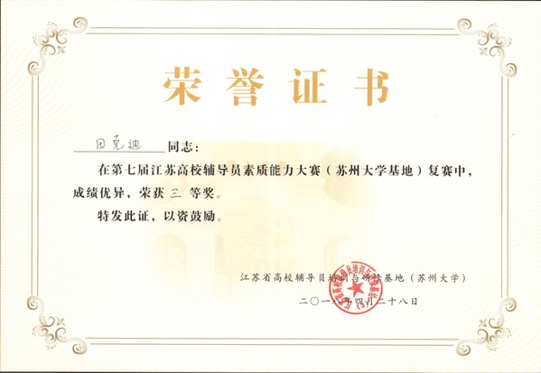 4月27日至28日,由江苏省教育厅主办、江苏省高校辅导员工作研究会承办,江苏省高校辅导员培训与研修苏州大学基地协办的“第七届江苏高校辅导员素质能力大赛复赛”在东吴饭店咖西会议室举行。来自苏州、无锡、常州、南通、泰州5市18所本科院校与独立学院的18名优秀辅导员参加竞赛,各参赛高校领队、专职辅导员以及苏州大学辅导员代表观摩了竞赛。我院田克迪老师荣获大赛三等奖。