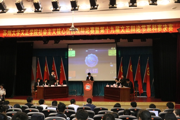 5月2日晚,由我院团委和社团联合会联合主办,文正辩论社承办的苏州大学文正学院社会主义核心价值观辩论赛暨第十九届文正辩论节之系科争霸赛决赛在学术报告厅举行。我院院长助理、学生工作部部长(兼)卞海勇,学生处处长助理孙兰镇及学生处全体团学指导老师出席活动。苏州大学教育学院副教授、我院心理学专业建设负责人吴铁钧老师,苏州大学2012级资深辩手傅思,苏州大学2013级资深辩手商锵,我院2015级资深辩手、文正辩论社社长严怿舟,我院2015级资深辩手、文正辩论社副社长曹家馨担任了本次决赛的评委嘉宾。