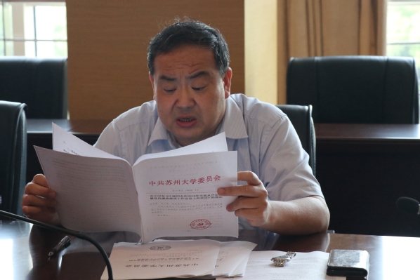 院党委书记仲宏对当前党风廉政建设工作大局进行了深入介绍,并强调了进一步做好从严治党和营造风清气正政治生态的重要性。他对苏州大学近期召开的相关会议精神和内容进行了传达,对《中共苏州大学纪律检查委员会落实党风廉政建设监督责任清单》《中共苏州大学委员会落实全面从严治党主体责任清单(试行)》等文件进行了解读,并和大家认真学习了苏州大学党委书记江涌同志在2018年全面从严治党暨党风廉政建设工作会议上的讲话。