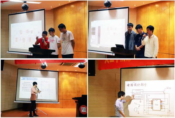 各组选手按照抽签顺序依次展示作品的“设计目的”“设计方案”“设计模块”“预期功能”“心得体会”等,对作品进行详细分析与解说,评委对参赛选手进行现场点评、提问并进行评分。