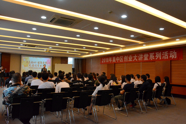 随后,同学们参加了2018吴中区创业大讲堂第四期“不忘初心·继续前行——走进创客世界”的讲座。此次讲座特邀金枫集团市场总监蔡毅良、TSITE创始人王阳、苏州新启成传媒股份有限公司总裁朱恋与同学们分享相关主题内容。