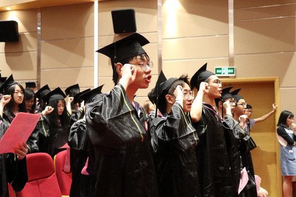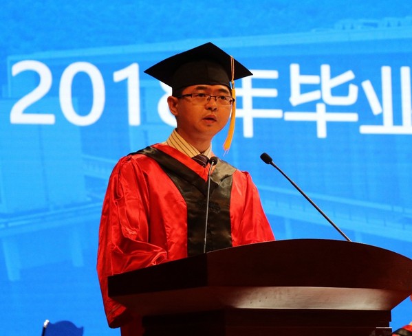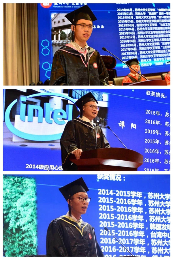 2014级法学专业学生吕治浩、2014级应用心理学专业学生谭阳、2014级计算机科学与技术专业学生曹振分别作为优秀毕业生代表上台发言,并与全体毕业生共同宣读毕业誓词。