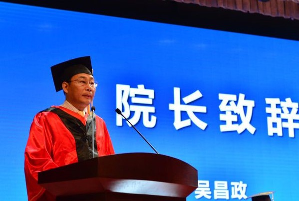 院长吴昌政非常接地气的致辞让全场气氛热烈。针对社会普遍存在的浮躁心态,他告诉学生,“时间是碎片的,但你的梦想应该完整”。随着智能手机的普及,很多人都患上了手机依赖征,他提醒大家,“少刷点朋友圈,圈里都是别人的生活;多读几本书,这样才能走好自己的路”。走出校门,学生就要面临工作和生活的压力,他告诉大家“宁静致远、行稳致远,只有这样才能越走越远”,并给出“方法论”——“外卖少吃点,自己多做点;加班悠着点,锻炼勤着点;组队吃鸡少一点,亲人通话多一点”。