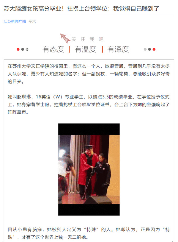 她叫赵琳琳,16英语(W)专业学生,以绩点3.5的成绩毕业。在学位授予仪式上,她身穿着学士服,拄着拐杖上台领取学位证书,台上台下为她的坚强响起了阵阵掌声。