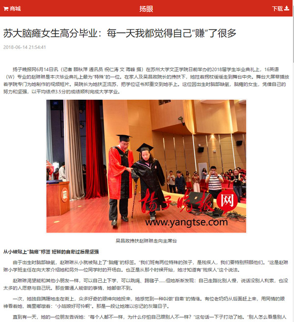 扬子晚报网6月14日讯(记者 顾秋萍 通讯员 祝仁涛 文 蒋峰 摄)在苏州大学文正学院日前举办的2018届学生毕业典礼上,16英语(W)专业的赵琳琳是本次毕业典礼上最为“特殊”的一位。在家人及吴昌政院长的搀扶下,她拄着拐杖缓缓走到舞台中央。舞台大屏幕播放着学院专门为她制作的视频短片。吴院长为她扶正流苏,把学位证书郑重交到她手上。这位因出生时脑部缺氧,脑瘫的女生,凭借自己的努力和坚强,以平均绩点3.5分的成绩顺利完成大学学业。