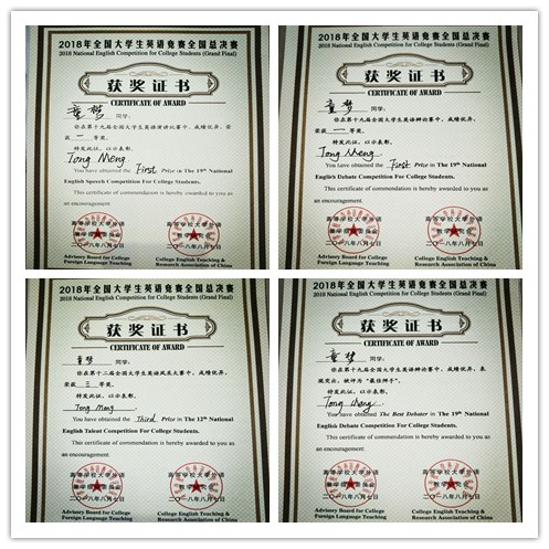 2018年8月7日全国大学生英语竞赛总决赛夏令营活动在浙江越秀外国语学院落下帷幕,我院15英语的童梦同学在活动中,荣获第十九届全国大学生英语竞赛辩论赛一等奖、第十九届全国大学生英语竞赛辩论赛“最佳辩手”、第十九届全国大学生英语竞赛演讲比赛一等奖、第十二届全国大学生英语风采大赛三等奖等荣誉。