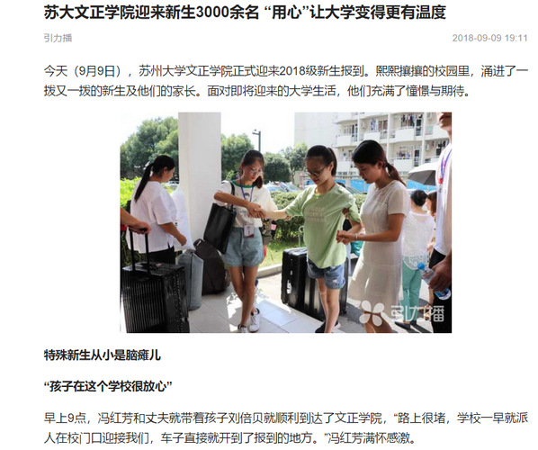 据了解,2018级劳动与社会保障专业的新生刘倍贝是今年报到现场最为“特殊”的一位。自小就被诊断为脑瘫的她,从小腿脚就很不便,出生10个月就一直待在园区一所康复学校,一待就是十几年。在此期间,没有上过小学的她,14岁前只有靠身为数学教师的妈妈周末指导下课程。后来,硬是凭借着没日没夜的自我补习,考上了相城区知名的重点中学。