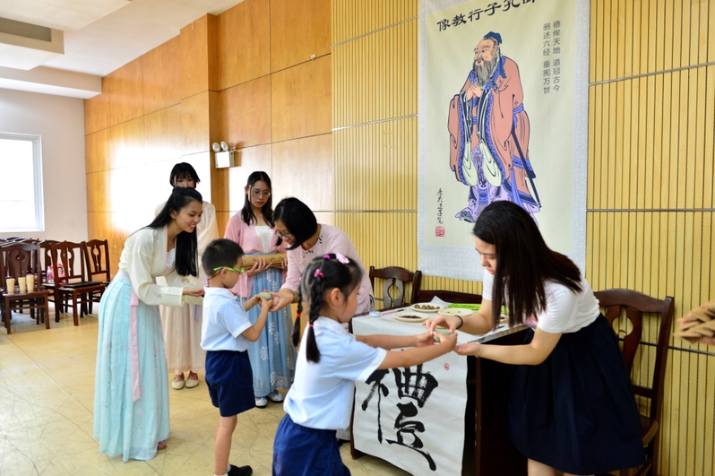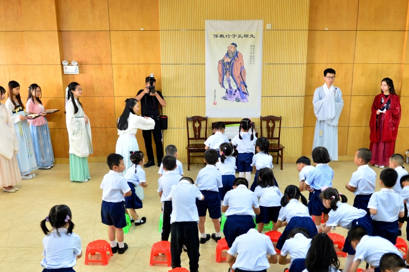 传统文化礼仪课堂包括汉服礼仪展示秀、书法国画体验课和礼茶拜师启智礼等环节。