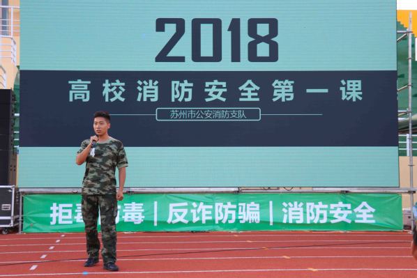 9月28日下午,由苏州市公安局、苏州市禁毒委员会办公室、共青团苏州市委员会等单位联合举办的“青盾行动”——苏州高校公共安全教育开学第一课巡讲活动在我院运动场举行。巡讲活动面向全体2018级新生,来自苏州市公安局等单位的领导以及我院副院长蒋峰、保卫处处长钱伟超等参加了活动。