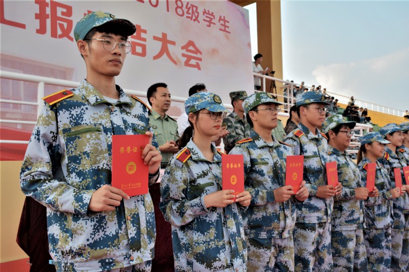 胡新华宣读2018级本科生军事技能训练先进集体、先进个人名单。主席台就坐的领导分别为先进连队、优秀指导员、优秀学员等获奖代表颁奖。