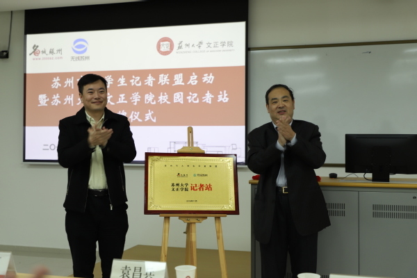 金磊与仲宏分别代表名城苏州和学院为校园记者站揭牌,这也是大学生记者联盟的首个校园记者站。