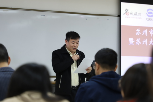 名城苏州网总编辑金磊的发言热情洋溢。他对名城苏州和无线苏州的发展历程进行了介绍。他表示,当下新媒体依托网络发展,已经逐步成为大学生了解信息的重要来源、表达观点的便捷方式及社交活动的热门渠道,并深刻影响着高校校园文化的发展和变革,校园和传媒的联动发展,势在必行。而文正学院有着浓厚的校园媒体氛围和一批朝气蓬勃的年轻人,“大学生记者联盟”的成立,将搭起媒体和高校沟通的桥梁。