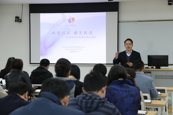 11月14日下午,《燃情创业 携手共进——苏州市公共创业服务介绍》讲座在综合楼122举办。本次讲座主讲人为苏州市劳动就业管理服务中心(苏州市创业指导中心)创业指导科科长盛江华,我院党委副书记、副院长袁昌兵、2019届毕业班班主任和部分毕业生参与活动,讲座由招生就业处处长宋丹主持。