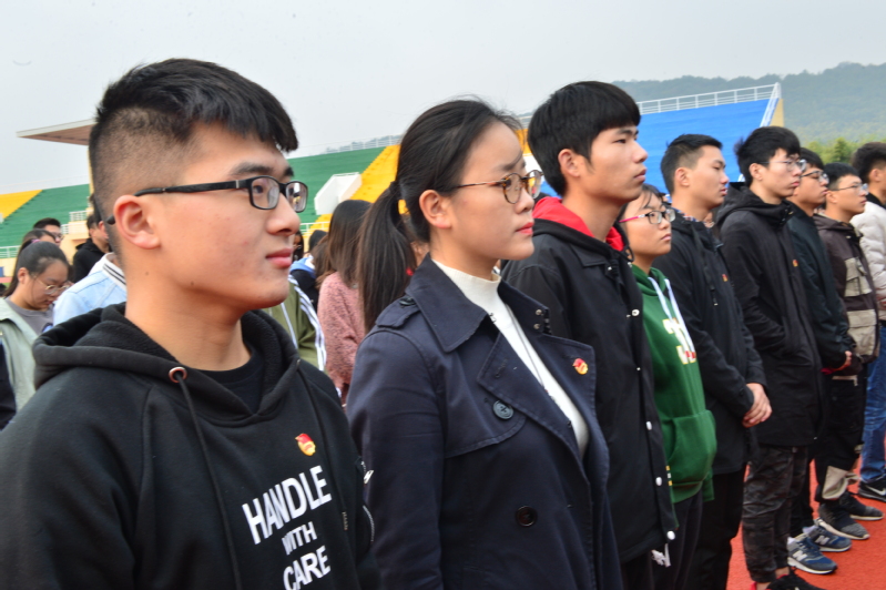 国旗护卫队的成员们迈着整齐的步伐,喊着响亮的口号,出现在运动场上。入团仪式在肃穆庄重的升旗仪式中拉开序幕。何玉在宣布新团员名单之后,在场的老团员为100位新团员佩戴团徽。团委组织部部长16电气(中外合作)邱林烨带领新团员们入团宣誓。“我志愿加入中国共产主义青年团,……”响亮的誓言代表了新团员的心声。