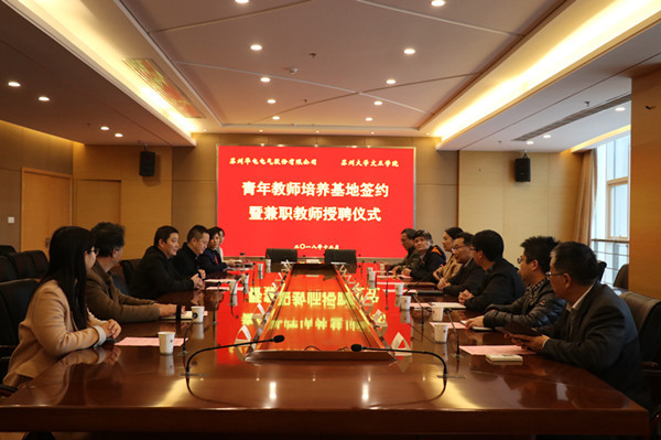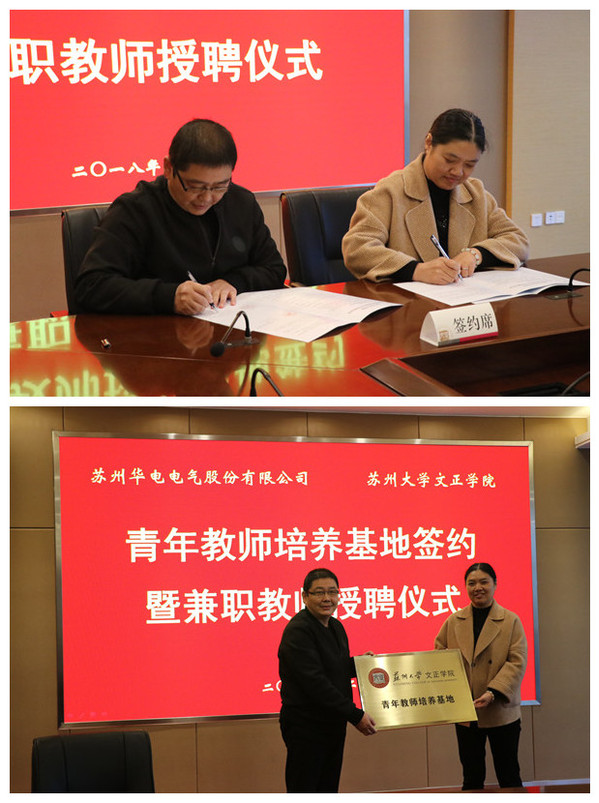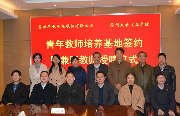 为进一步拓宽青年教师的成长途径,提高青年教师的专业实践能力,建设一支高素质的“双师型”师资队伍,同时进一步加强校企合作,强化社会服务,为企业发展、项目研究、产品研发等贡献力量,我院于12月5日下午与苏州华电电气股份有限公司(以下简称苏州华电)举行青年教师培养基地建设事宜签约授牌仪式。苏州华电副总经理沈义成、研发中心主任姜杏辉,我院院长吴昌政,副院长施盛威,院长助理、教学工作部部长(兼)胡荣,光电与能源工程系(以下简称光电系)主任邹丽新,相关职能部门负责人及专业教师参加本次活动。仪式由胡荣主持。